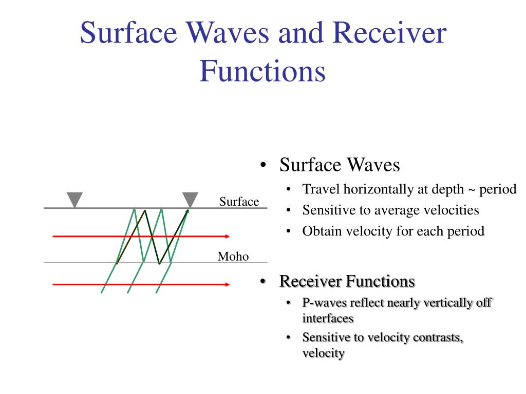 Surface Moho Surface Waves and Receiver Functions • Surface Waves • Travel horizontally at depth ~ period • Sensitive to average velocities • Obtain velocity for each period • Receiver Functions • P-waves reflect nearly vertically off interfaces • Sensitive to velocity contrasts, velocity