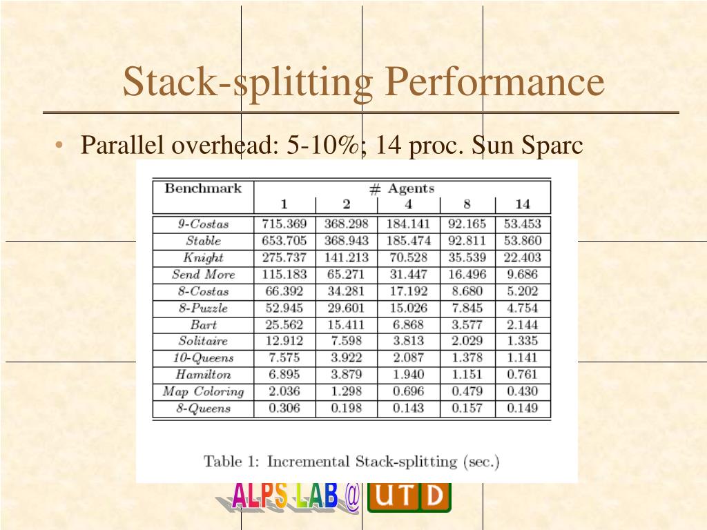 Stack-splitting Performance • Parallel overhead: 5-10%; 14 proc. Sun Sparc