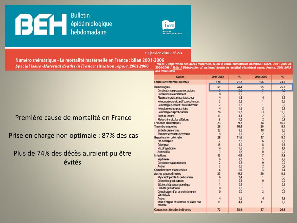 Première cause de mortalité en France Prise en charge non optimale : 87% des cas Plus de 74% des décès auraient pu être évités