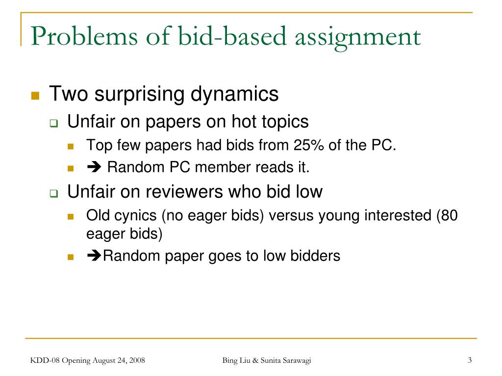 The KDD 2008 review process (Research track) Bing Liu & Sunita Sarawagi. Bid-based paper assignment. Reviewers bid on papers Scale between 3=Eager and 0=not-willing Initial Assignment Globally maximize total bids subject to load, count constraints Easily solved using any LP-package