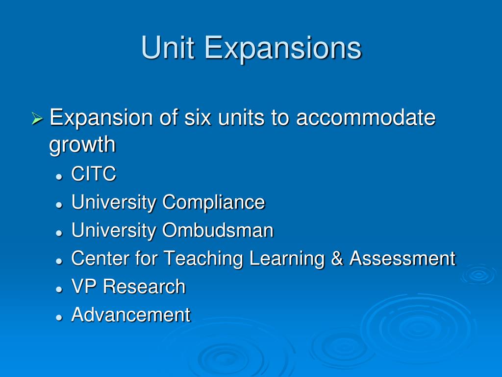Unit Expansions • Expansion of six units to accommodate growth • CITC • University Compliance • University Ombudsman • Center for Teaching Learning & Assessment • VP Research • Advancement