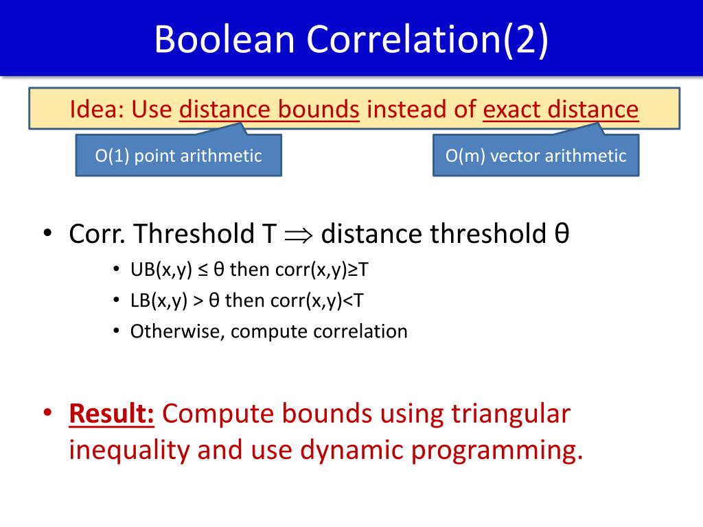 Boolean Correlation(2) Idea: Use distance bounds instead of exact distance • Corr. Threshold T distance threshold θ • UB(x,y) ≤ θ then corr(x,y)≥T • LB(x,y) > θ then corr(x,y)<T • Otherwise, compute correlation • Result: Compute bounds using triangular inequality and use dynamic programming. O(1) point arithmetic O(m) vector arithmetic