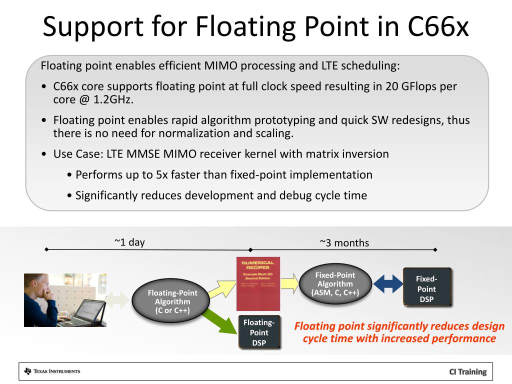 Support for Floating Point in C66x • Floating point enables efficient MIMO processing and LTE scheduling: • C66x core supports floating point at full clock speed resulting in 20 GFlops per core @ 1.2GHz. • Floating point enables rapid algorithm prototyping and quick SW redesigns, thus there is no need for normalization and scaling. • Use Case: LTE MMSE MIMO receiver kernel with matrix inversion • Performs up to 5x faster than fixed-point implementation • Significantly reduces development and debug cycle time ~1 day ~3 months Fixed-Point Algorithm (ASM, C, C++) Fixed-Point DSP Floating-Point Algorithm (C or C++) Floating-Point DSP Floating point significantly reduces design cycle time with increased performance