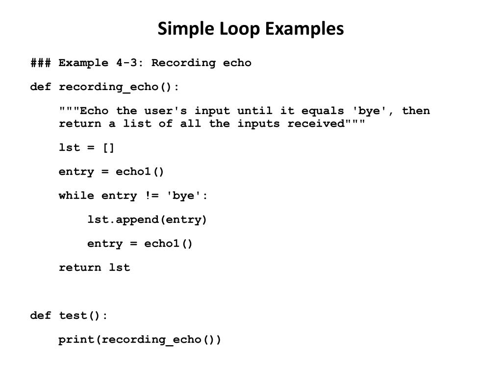 Simple Loop Examples ### Example 4-3: Recording echo defrecording_echo(): """Echo the user's input until it equals 'bye', then return a list of all the inputs received""" lst = [] entry = echo1() while entry != 'bye': lst.append(entry) entry = echo1() return lst def test(): print(recording_echo())