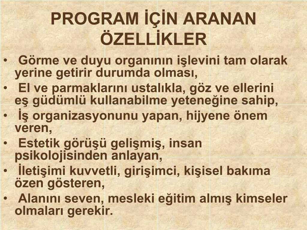 PROGRAM İÇİN ARANAN ÖZELLİKLER • Görme ve duyu organının işlevini tam olarak yerine getirir durumda olması, • El ve parmaklarını ustalıkla, göz ve ellerini eş güdümlü kullanabilme yeteneğine sahip, • İş organizasyonunu yapan, hijyene önem veren, • Estetik görüşü gelişmiş, insan psikolojisinden anlayan, • İletişimi kuvvetli, girişimci, kişisel bakıma özen gösteren, • Alanını seven, mesleki eğitim almış kimseler olmaları gerekir.