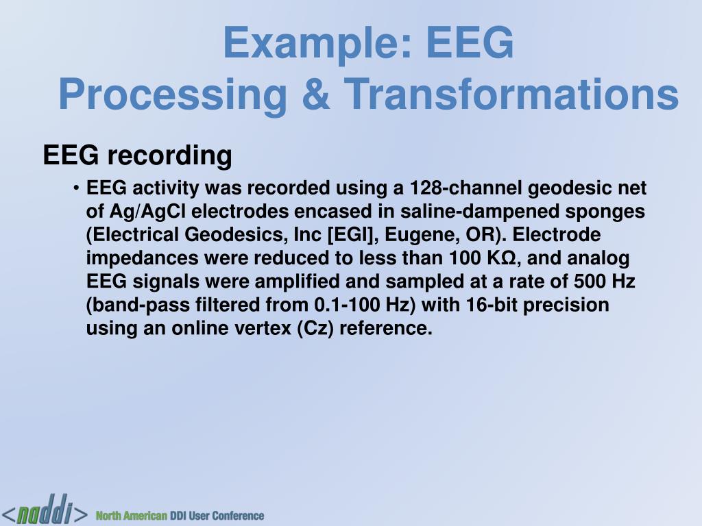 Example: EEG Processing & Transformations EEG recording • EEG activity was recorded using a 128-channel geodesic net of Ag/AgCl electrodes encased in saline-dampened sponges (Electrical Geodesics, Inc [EGI], Eugene, OR). Electrode impedances were reduced to less than 100 KΩ, and analog EEG signals were amplified and sampled at a rate of 500 Hz (band-pass filtered from 0.1-100 Hz) with 16-bit precision using an online vertex (Cz) reference.