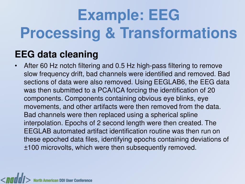 Example: EEG Processing & Transformations EEG data cleaning After 60 Hz notch filtering and 0.5 Hz high-pass filtering to remove slow frequency drift, bad channels were identified and removed. Bad sections of data were also removed. Using EEGLAB6, the EEG data was then submitted to a PCA/ICA forcing the identification of 20 components. Components containing obvious eye blinks, eye movements, and other artifacts were then removed from the data. Bad channels were then replaced using a spherical spline interpolation. Epochs of 2 second length were then created. The EEGLAB automated artifact identification routine was then run on these epoched data files, identifying epochs containing deviations of ±100 microvolts, which were then subsequently removed.