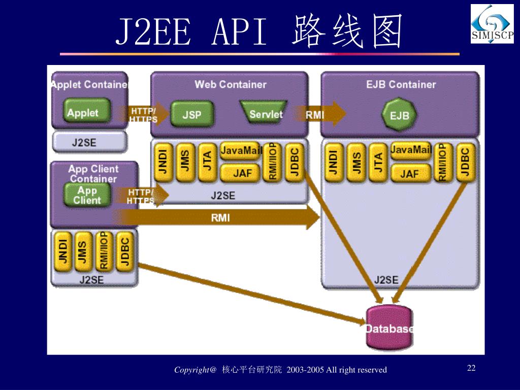 J2EE标准 • J2EE API • J2SE • RMI/IIOP • JDBC • JMS • JDNI • Servlet • JSP • JavaMail • JavaBean Activation Framework • EJB • JTA