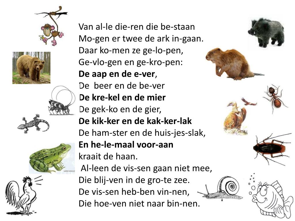 Van al-le die-ren die be-staan Mo-gen er twee de ark in-gaan. Daarko-men zege-lo-pen, Ge-vlo-gen en ge-kro-pen: De aap en de e-ver, De beer en de be-ver De kre-kel en de mier De gek-ko en de gier, De kik-ker en de kak-ker-lak De ham-ster en de huis-jes-slak, En he-le-maalvoor-aan kraait de haan. Al-leen de vis-sengaannietmee, Die blij-ven in de gro-te zee. De vis-senheb-ben vin-nen, Die hoe-vennietnaar bin-nen.