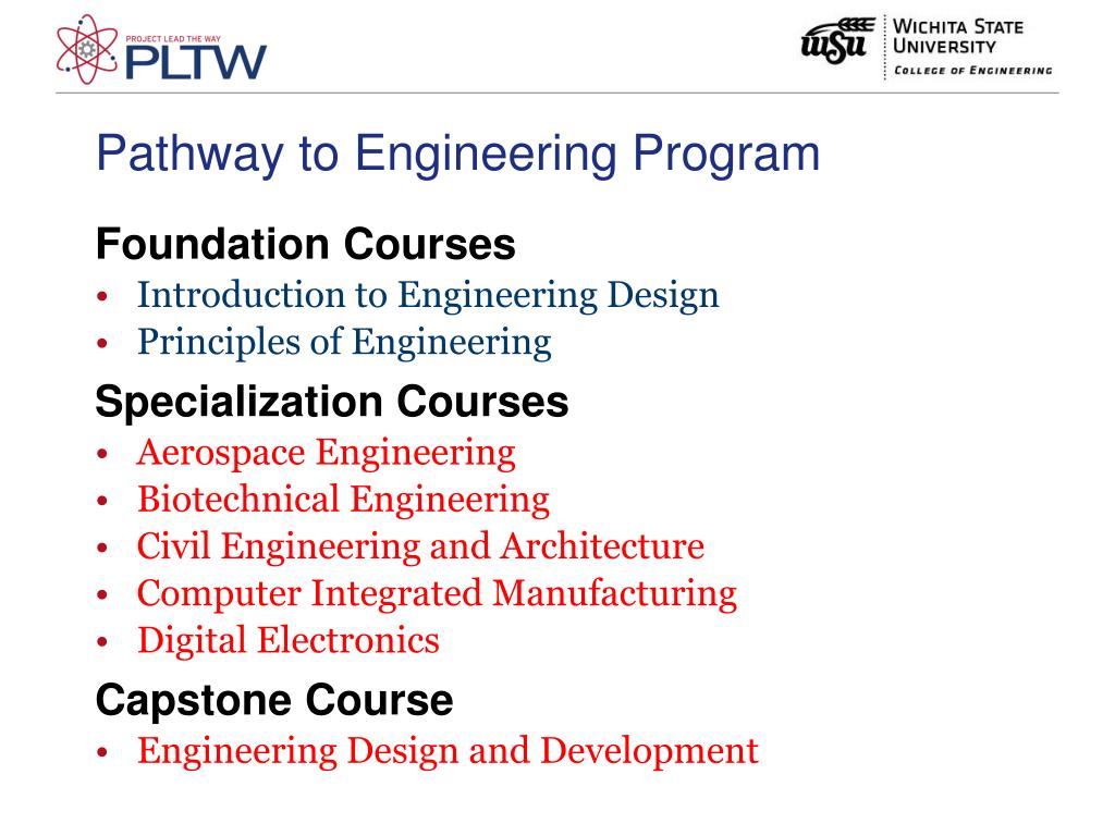 Pathway to Engineering Program Foundation Courses • Introduction to Engineering Design • Principles of Engineering Specialization Courses • Aerospace Engineering • Biotechnical Engineering • Civil Engineering and Architecture • Computer Integrated Manufacturing • Digital Electronics Capstone Course • Engineering Design and Development