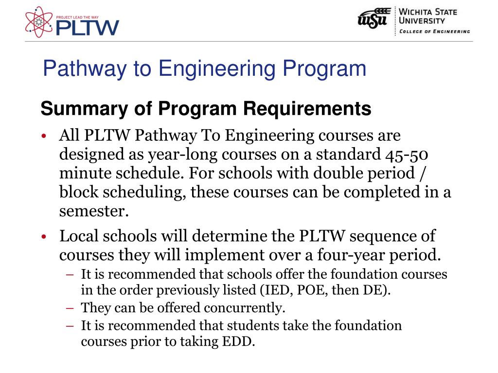 Pathway to Engineering Program Summary of Program Requirements • All PLTW Pathway To Engineering courses are designed as year-long courses on a standard 45-50 minute schedule. For schools with double period / block scheduling, these courses can be completed in a semester. • Local schools will determine the PLTW sequence of courses they will implement over a four-year period. • It is recommended that schools offer the foundation courses in the order previously listed (IED, POE, then DE). • They can be offered concurrently. • It is recommended that students take the foundation courses prior to taking EDD.