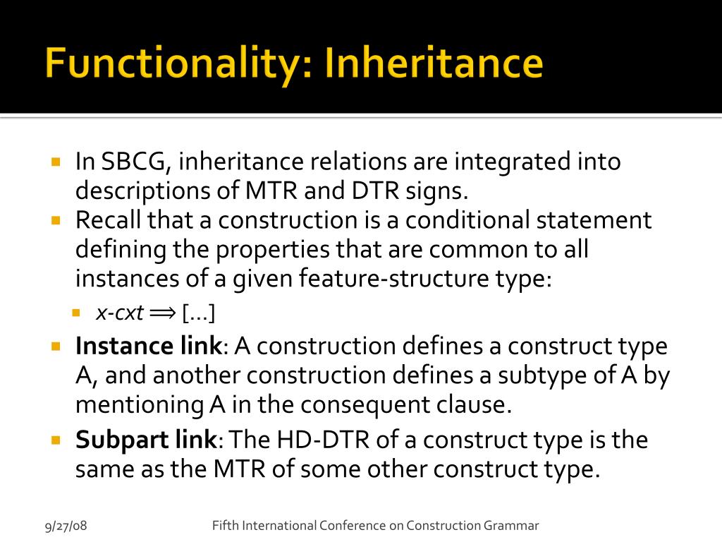 Functionality: Inheritance • In SBCG, inheritance relations are integrated into descriptions of MTR and DTR signs. • Recall that a construction is a conditional statement defining the properties that are common to all instances of a given feature-structure type: • x-cxt ⟹ […] • Instance link: A construction defines a construct type A, and another construction defines a subtype of A by mentioning A in the consequent clause. • Subpart link: The HD-DTR of a construct type is the same as the MTR of some other construct type. Fifth International Conference on Construction Grammar