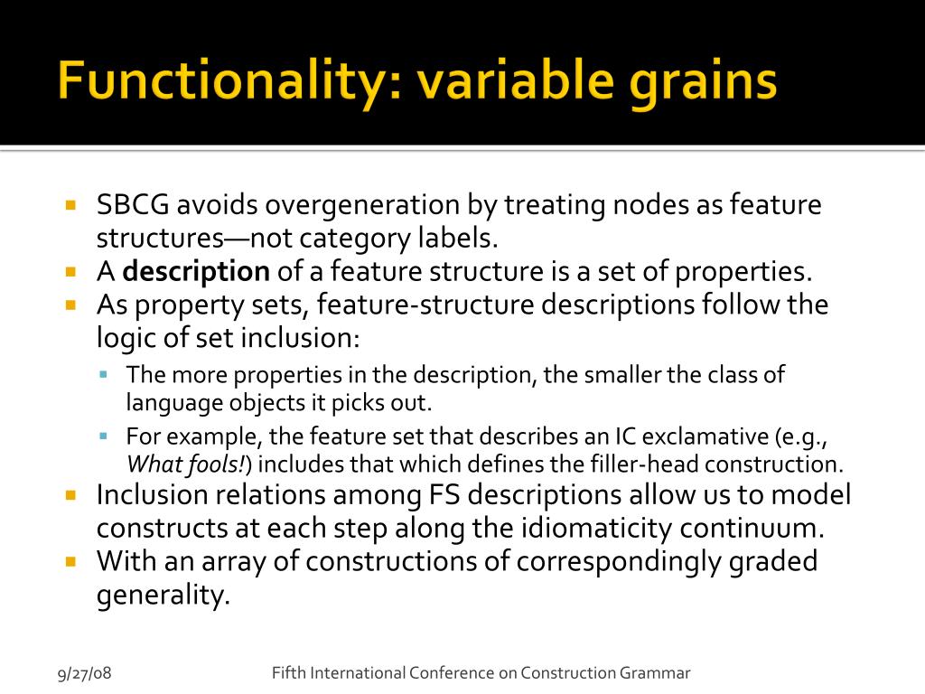 Functionality: variable grains • SBCG avoids overgeneration by treating nodes as feature structures—not category labels. • A description of a feature structure is a set of properties. • As property sets, feature-structure descriptions follow the logic of set inclusion: • The more properties in the description, the smaller the class of language objects it picks out. • For example, the feature set that describes an IC exclamative (e.g., What fools!) includes that which defines the filler-head construction. • Inclusion relations among FS descriptions allow us to model constructs at each step along the idiomaticity continuum. • With an array of constructions of correspondingly graded generality. Fifth International Conference on Construction Grammar