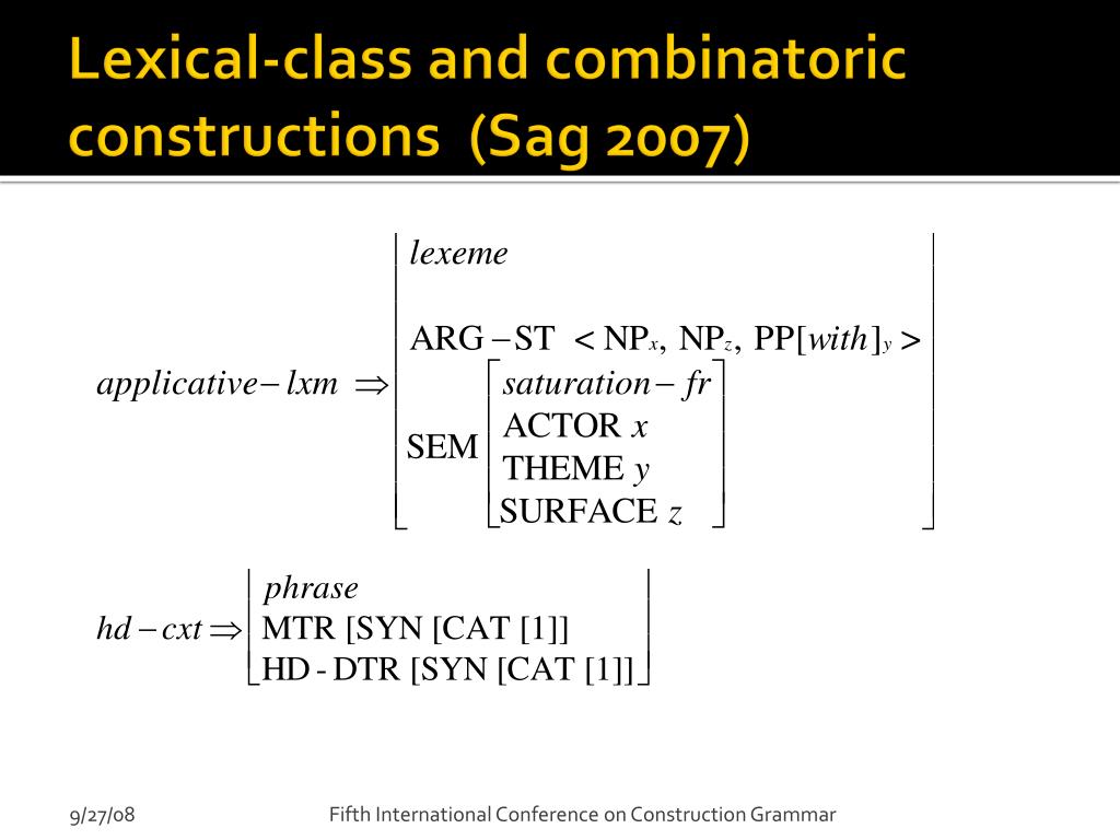 Lexical-class and combinatoric constructions (Sag 2007) Fifth International Conference on Construction Grammar