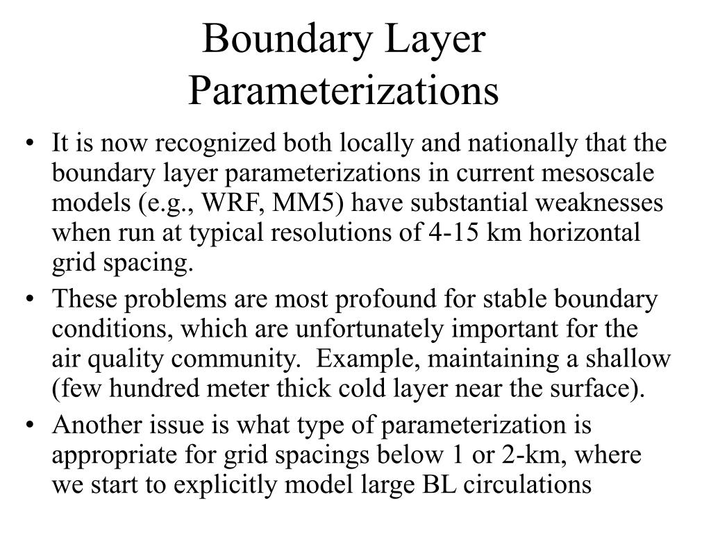 Boundary Layer Parameterizations • It is now recognized both locally and nationally that the boundary layer parameterizations in current mesoscale models (e.g., WRF, MM5) have substantial weaknesses when run at typical resolutions of 4-15 km horizontal grid spacing. • These problems are most profound for stable boundary conditions, which are unfortunately important for the air quality community. Example, maintaining a shallow (few hundred meter thick cold layer near the surface). • Another issue is what type of parameterization is appropriate for grid spacings below 1 or 2-km, where we start to explicitly model large BL circulations