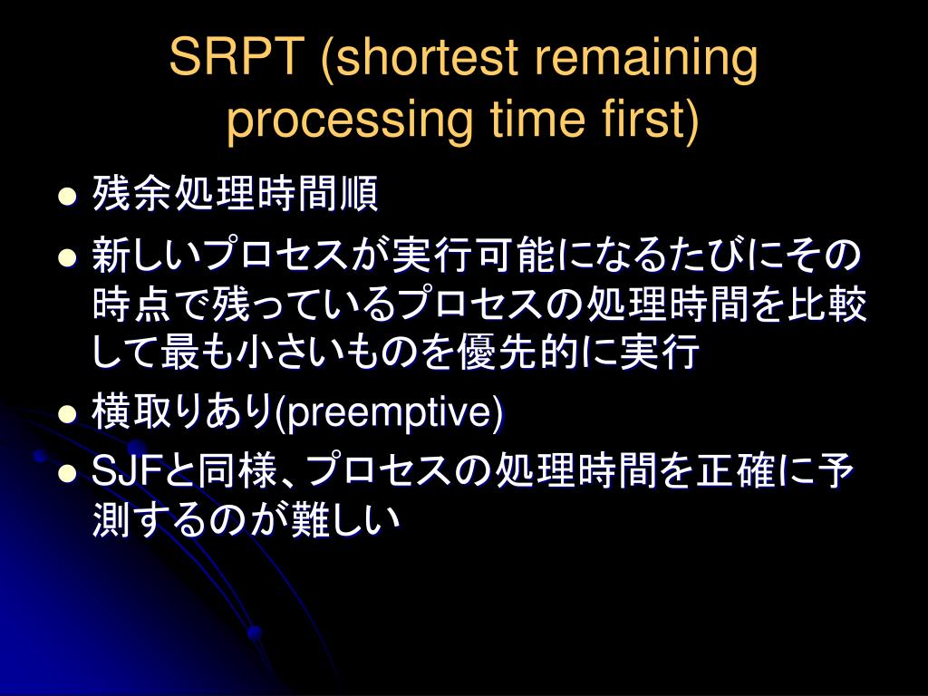 SRPT (shortest remaining processing time first) • 残余処理時間順 • 新しいプロセスが実行可能になるたびにその時点で残っているプロセスの処理時間を比較して最も小さいものを優先的に実行 • 横取りあり(preemptive) • SJFと同様、プロセスの処理時間を正確に予測するのが難しい