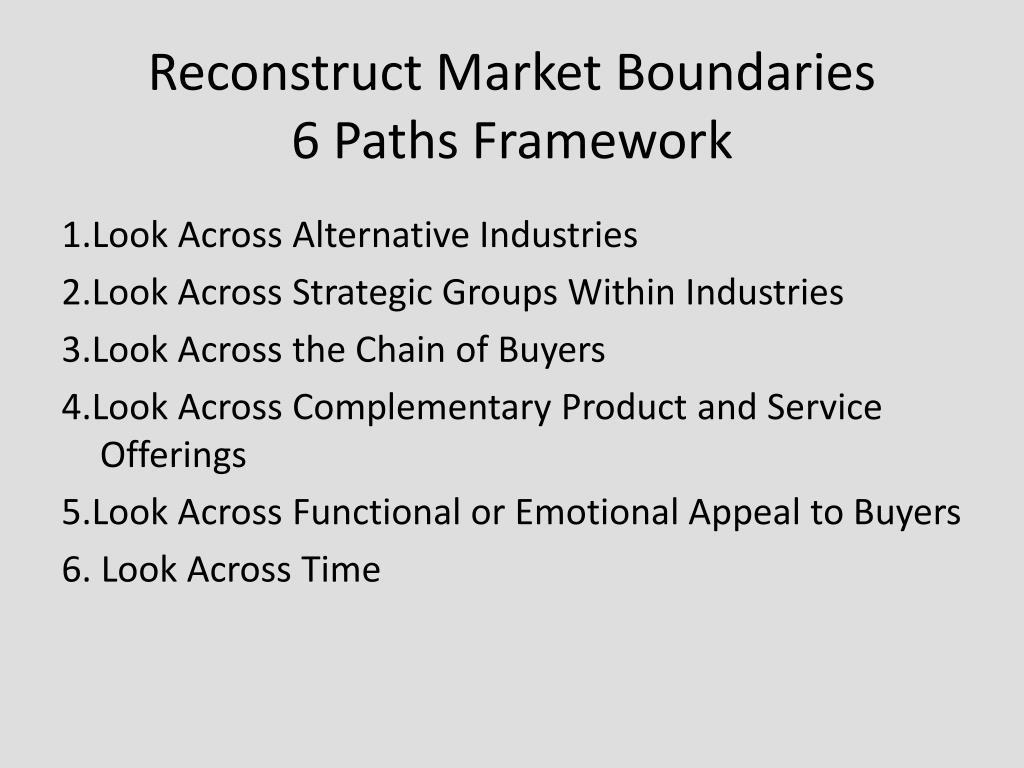 Reconstruct Market Boundaries6 Paths Framework 1.Look Across Alternative Industries 2.Look Across Strategic Groups Within Industries 3.Look Across the Chain of Buyers 4.Look Across Complementary Product and Service Offerings 5.Look Across Functional or Emotional Appeal to Buyers 6. Look Across Time