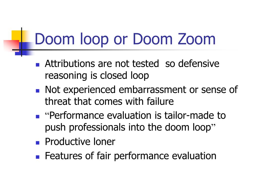 Doom loop or Doom Zoom • Attributions are not tested so defensive reasoning is closed loop • Not experienced embarrassment or sense of threat that comes with failure • “Performance evaluation is tailor-made to push professionals into the doom loop” • Productive loner • Features of fair performance evaluation