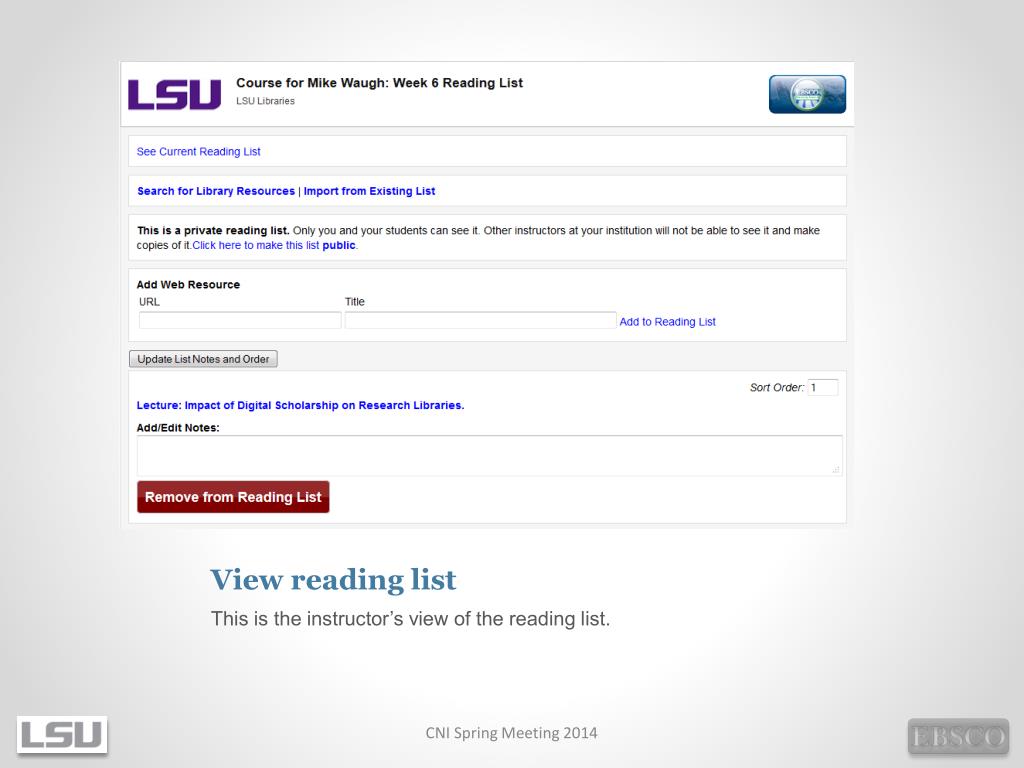 View reading list This is the instructor’s view of the reading list. CNI Spring Meeting 2014