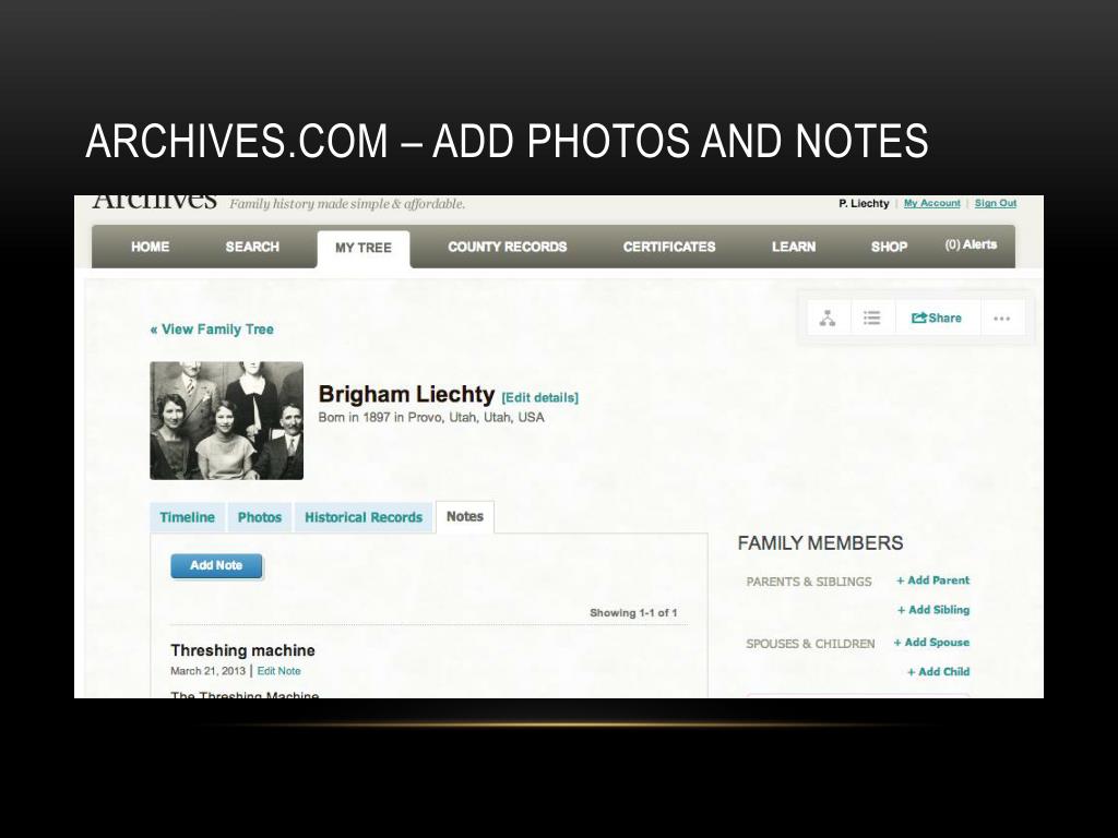 Sites for sharing ancestors • Archives.com • Can upload photos • Can add notes to an ancestor • Notes can be very long (Stories) • Free tree to everyone • Only pay for accessing records