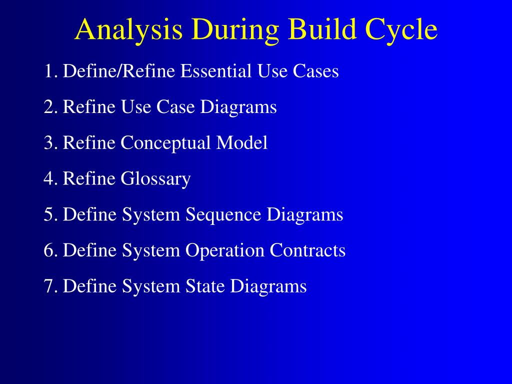Analysis During Build Cycle 1. Define/Refine Essential Use Cases 2. Refine Use Case Diagrams 3. Refine Conceptual Model 4. Refine Glossary 5. Define System Sequence Diagrams 6. Define System Operation Contracts 7. Define System State Diagrams
