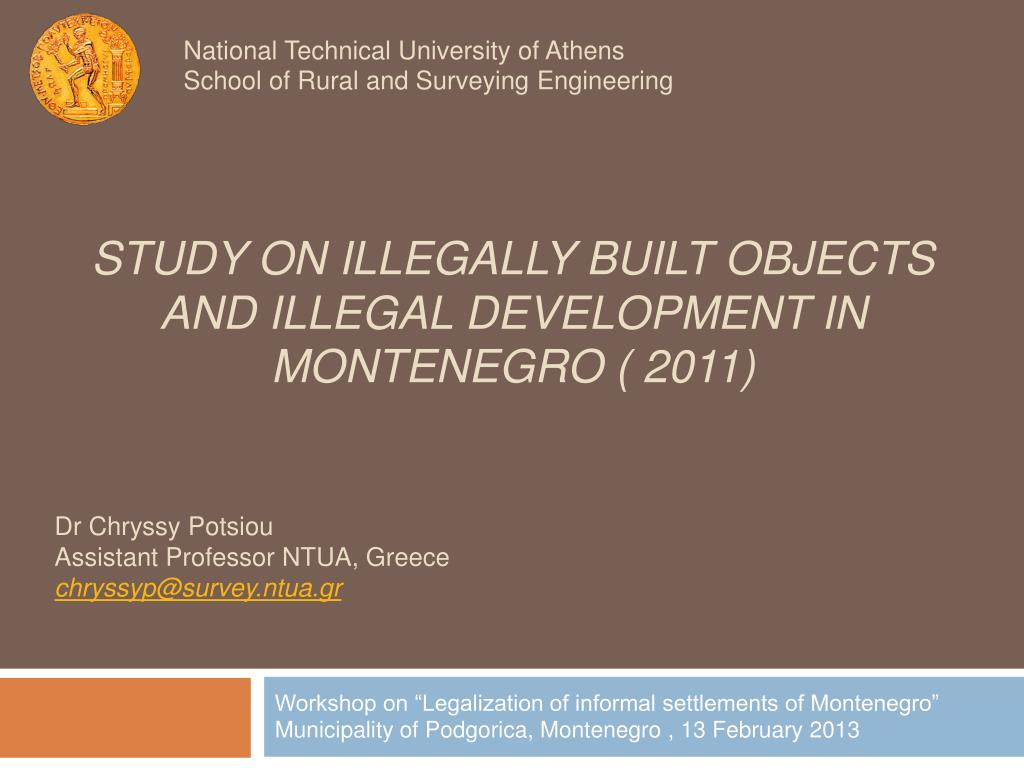 National Technical University of Athens School of Rural and Surveying Engineering. Study on Illegally Built Objects and Illegal Development in Montenegro ( 2011). Dr Chryssy Potsiou Assistant Professor NTUA, Greece chryssyp@survey.ntua.gr.
