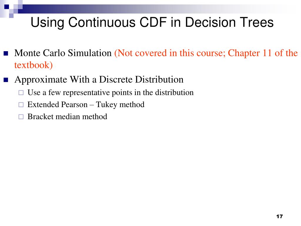 Using Continuous CDF in Decision Trees • Monte Carlo Simulation (Not covered in this course; Chapter 11 of the textbook) • Approximate With a Discrete Distribution • Use a few representative points in the distribution • Extended Pearson – Tukey method • Bracket median method