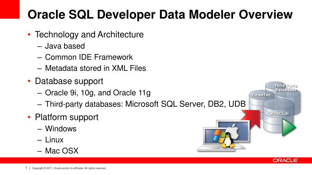 Oracle SQL Developer Data Modeler Overview • Technology and Architecture • Java based • Common IDE Framework • Metadata stored in XML Files • Database support • Oracle 9i, 10g, and Oracle 11g • Third-party databases: Microsoft SQL Server, DB2, UDB • Platform support • Windows • Linux • Mac OSX