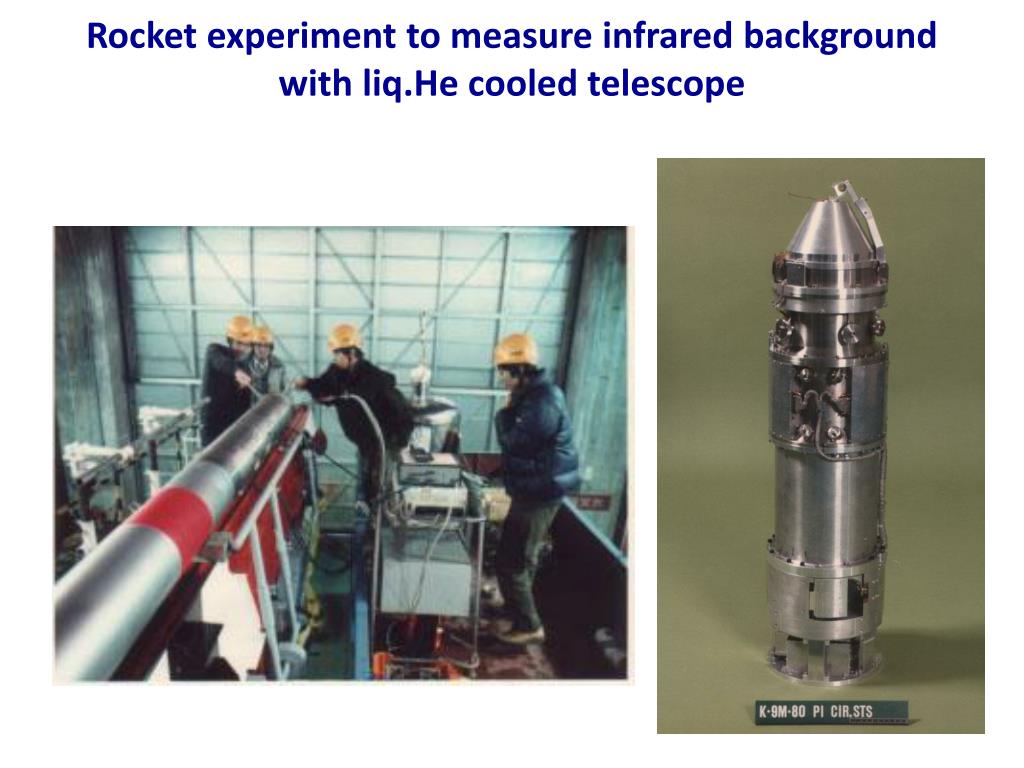 Based on the success of IRTS, we proposed dedicated infrared astronomical satellite to ISAS, ASTRO-F (AKARI), on 1995ASTRO-F●70 cm aperture, liq.He cooled telescope●Survey mission, higher sensitivity and better spatial resolution longer wavelength band (200mm) than IRAS