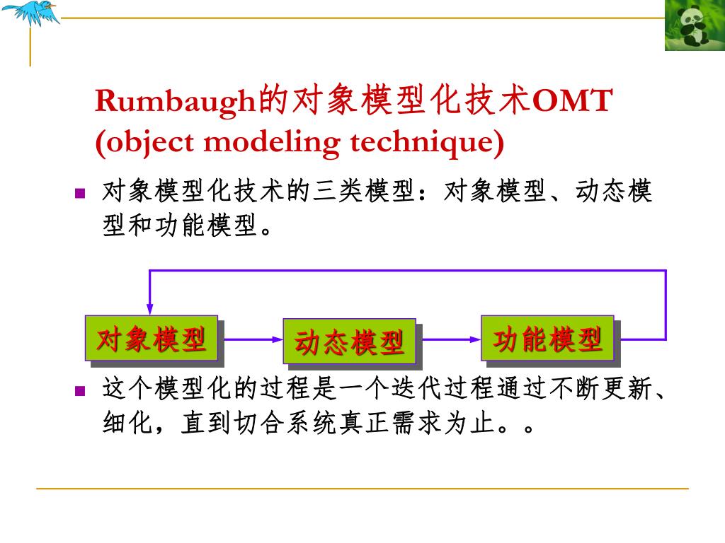 对象模型 功能模型 动态模型 Rumbaugh的对象模型化技术OMT(object modeling technique) • 对象模型化技术的三类模型:对象模型、动态模型和功能模型。 • 这个模型化的过程是一个迭代过程通过不断更新、细化,直到切合系统真正需求为止。。