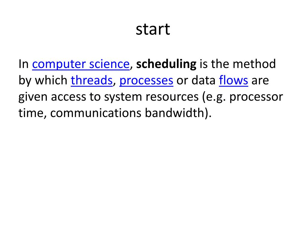 start In computer science, scheduling is the method by which threads, processes or data flows are given access to system resources (e.g. processor time, communications bandwidth).