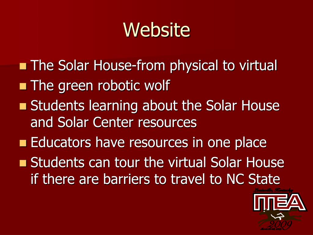 Website • The Solar House-from physical to virtual • The green robotic wolf • Students learning about the Solar House and Solar Center resources • Educators have resources in one place • Students can tour the virtual Solar House if there are barriers to travel to NC State