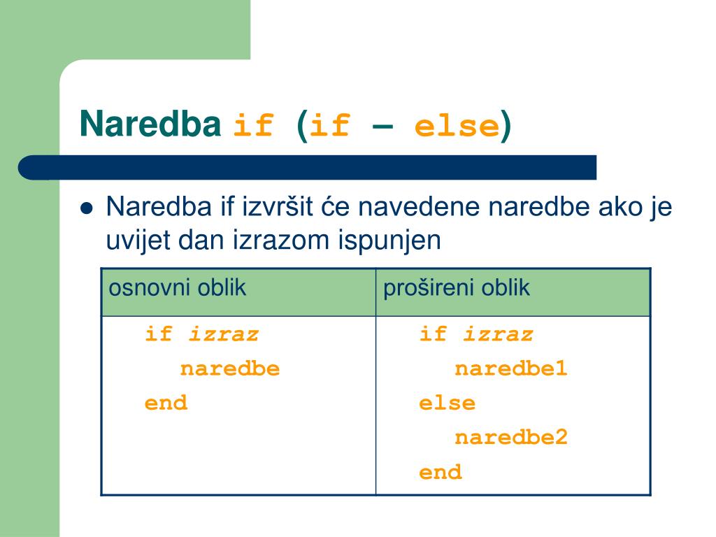 Naredba if (if – else) • Naredba if izvršit će navedene naredbe ako je uvijet dan izrazom ispunjen