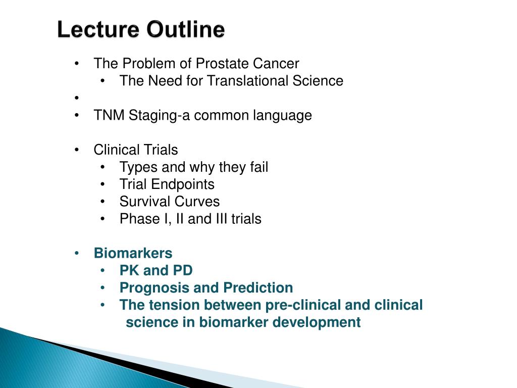 Lecture Outline • The Problem of Prostate Cancer • The Need for Translational Science • TNM Staging-a common language • Clinical Trials • Types and why they fail • Trial Endpoints • Survival Curves • Phase I, II and III trials • Biomarkers • PK and PD • Prognosis and Prediction • The tension between pre-clinical and clinical • science in biomarker development