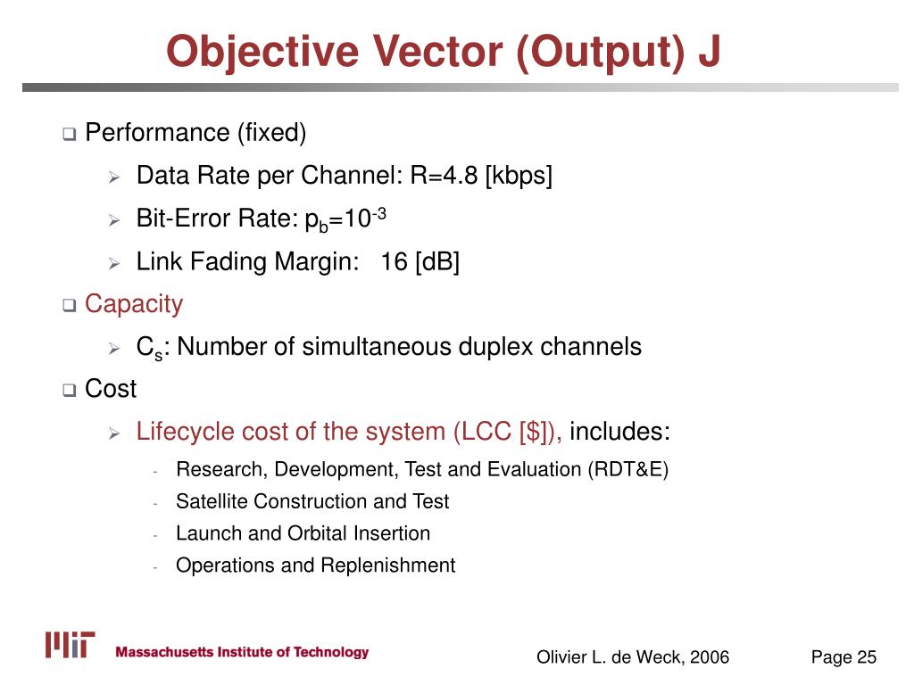 Objective Vector (Output) J • Performance (fixed) • Data Rate per Channel: R=4.8 [kbps] • Bit-Error Rate: pb=10-3 • Link Fading Margin: 16 [dB] • Capacity • Cs: Number of simultaneous duplex channels • Cost • Lifecycle cost of the system (LCC [$]), includes: • Research, Development, Test and Evaluation (RDT&E) • Satellite Construction and Test • Launch and Orbital Insertion • Operations and Replenishment