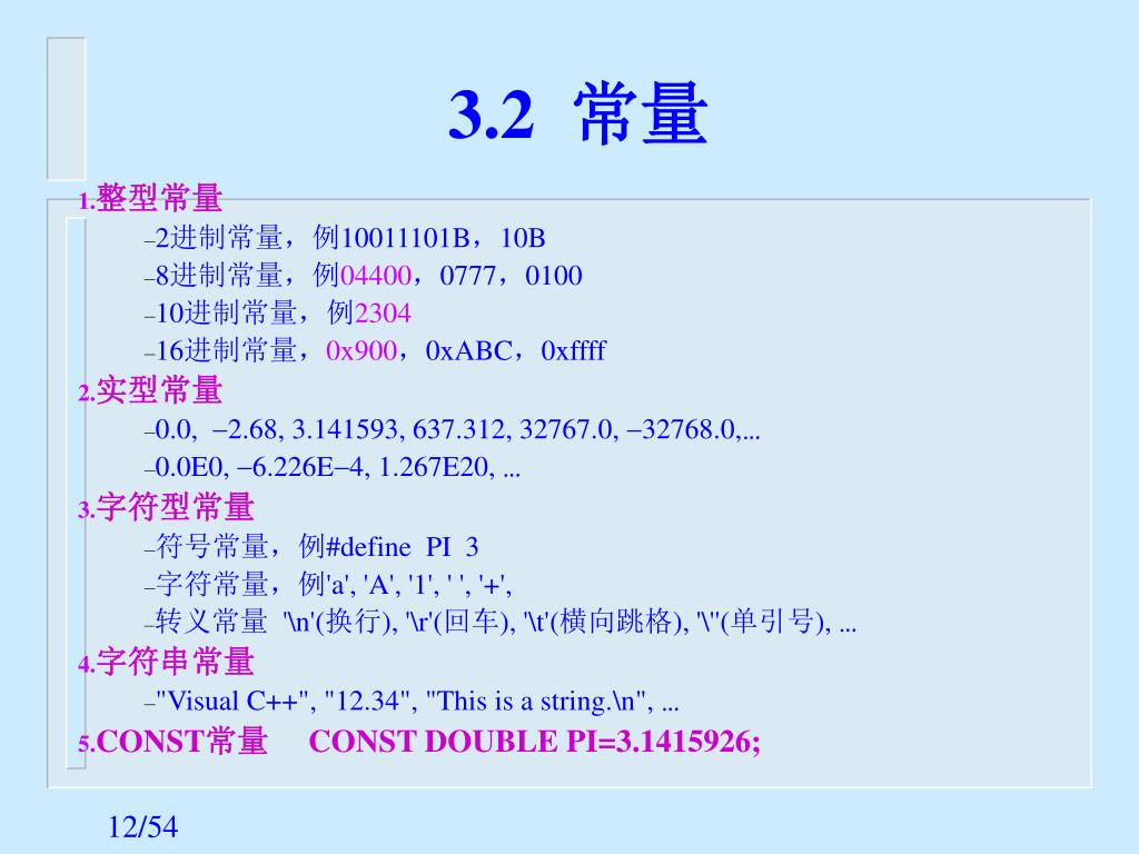 (1)符号常量 • 用#define定义的常数;类似变量,但不是变量。 • 例如: #define PI 3.1415926 • #define MAXNUM 10000 • 可以出现在表达式中; • f1= r * r * PI; • 但是不能作左值,下列用法是错误的: • PI = PI*PI ; • 用const定义的常数 • const double pi=3.1415926;