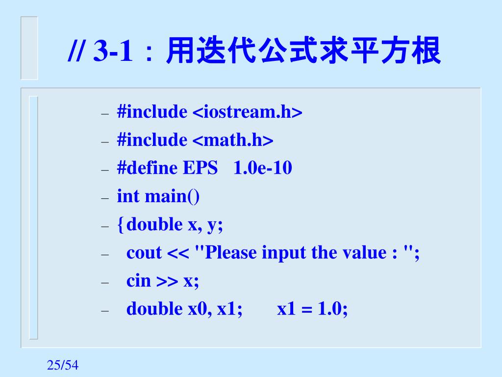 // 3-1:用迭代公式求平方根 • #include <iostream.h> • #include <math.h> • #define EPS 1.0e-10 • int main() • { double x, y; • cout << "Please input the value : "; • cin >> x; • double x0, x1; x1 = 1.0;