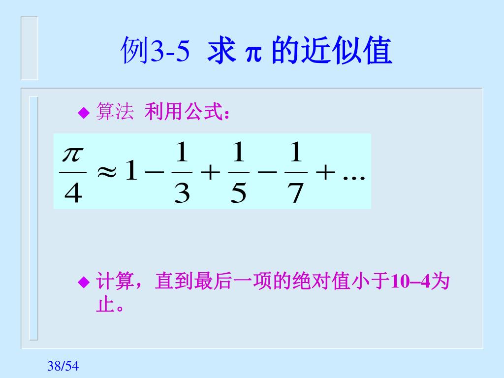 // Example 3-5:求π的近似值 #include <iostream.h> #include <math.h> int main() { int s = 1; double n = 1.0, u = 1.0, pi = 0.0; while(fabs(u)>=1e-4) { pi = pi+u; n = n+2; s = -s; //符号位的生成 u = s/n; } cout << "pi = " << 4*pi << endl; return 0; }