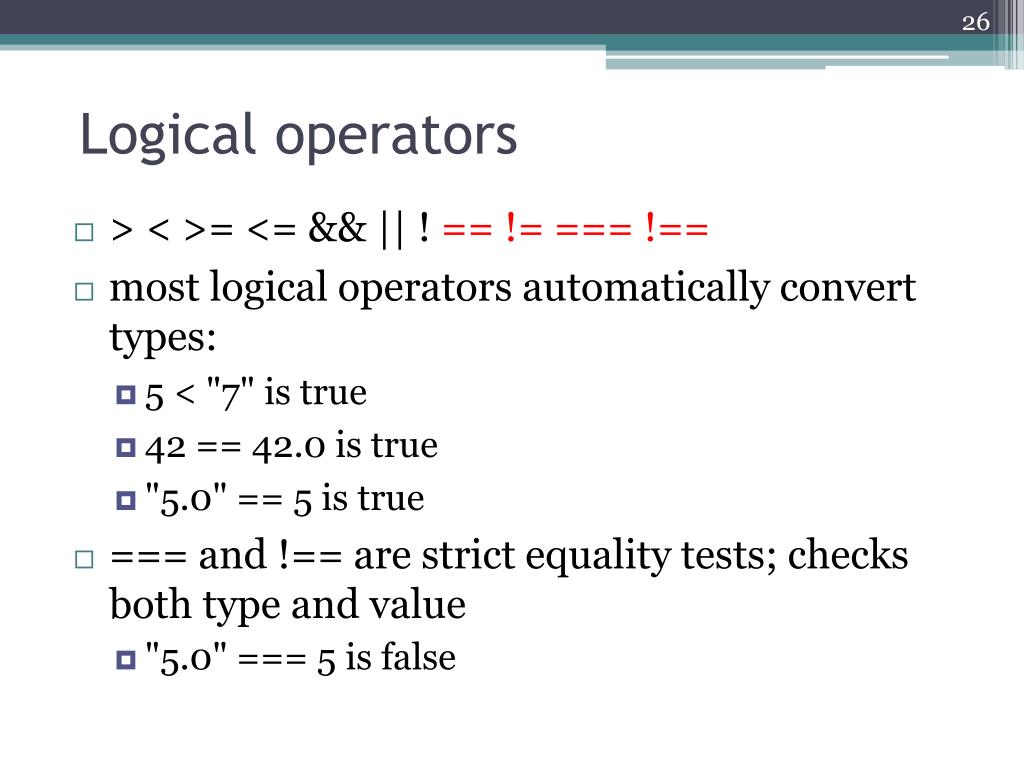 Logical operators • > < >= <= && || ! == != === !== • most logical operators automatically convert types: • 5 < "7" is true • 42 == 42.0 is true • "5.0" == 5 is true • === and !== are strict equality tests; checks both type and value • "5.0" === 5 is false