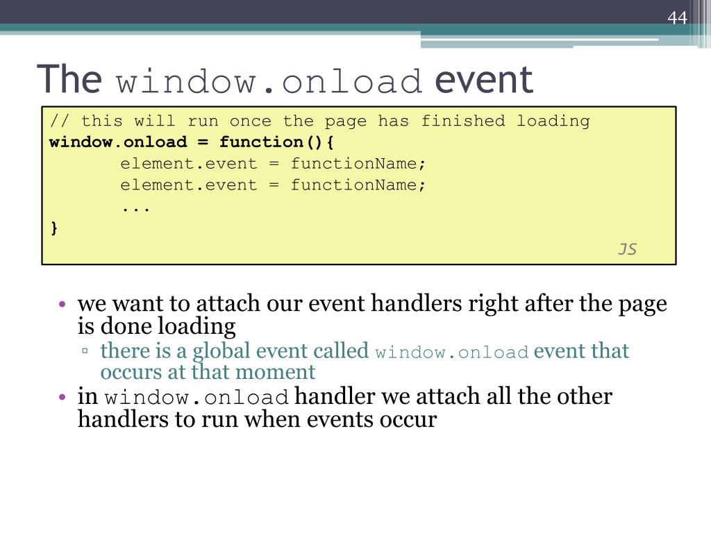 we want to attach our event handlers right after the page is done loading • there is a global event called window.onloadevent that occurs at that moment • in window.onload handler we attach all the other handlers to run when events occur The window.onload event // this will run once the page has finished loading window.onload= function(){ element.event = functionName; element.event = functionName; ... }JS