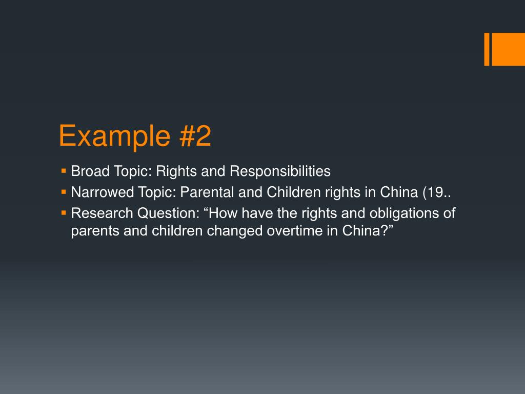 Example #2 • Broad Topic: Rights and Responsibilities • Narrowed Topic: Parental and Children rights in China (19.. • Research Question: “How have the rights and obligations of parents and children changed overtime in China?”