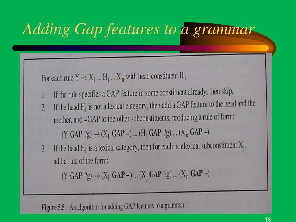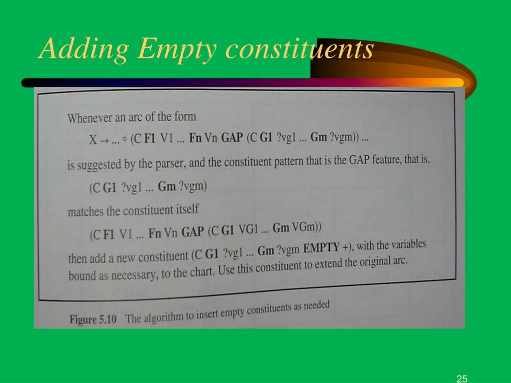 Holes and Fillers • There is a Hole somewhere in a constituent • The moved part is a Filler for that hole What will the fat man angrily put in the corner • Is parsed as if it were: … angrily put what in the corner What did you put in the cupboard? * What did you put the bottle in the cupboard