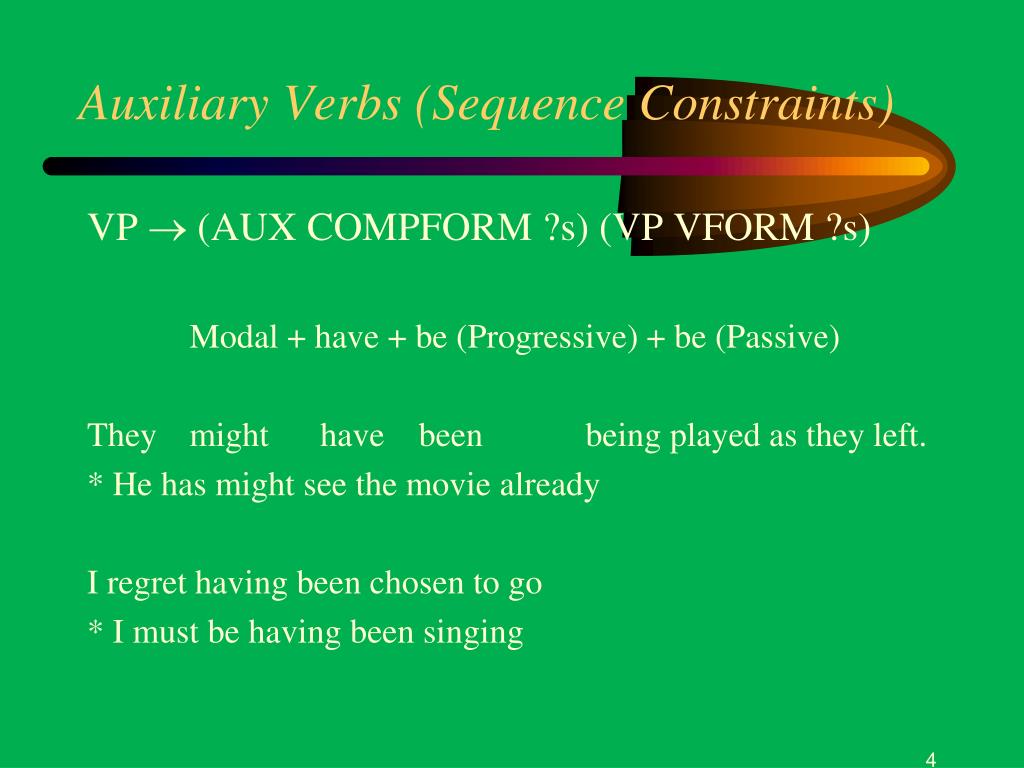Auxiliary Verbs (Sequence Constraints) VP (AUX COMPFORM ?s) (VP VFORM ?s) Modal + have + be (Progressive) + be (Passive) They might have been being played as they left. * He has might see the movie already I regret having been chosen to go * I must be having been singing