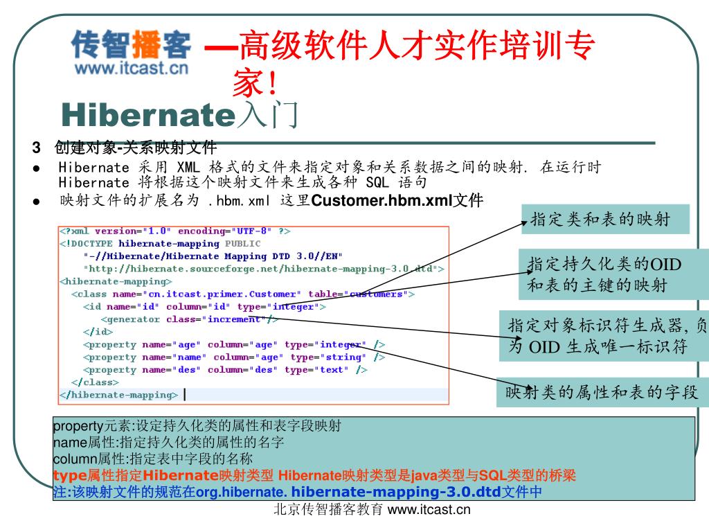 Hibernate入门 2 创建表和对应的javaBean文件(持久化类) create table customer ( id int primary key, name varchar(12), age int, des text ) publicclass Customer { private Integer id; private String name; private Integer age; private String des; } 北京传智播客教育 www.itcast.cn