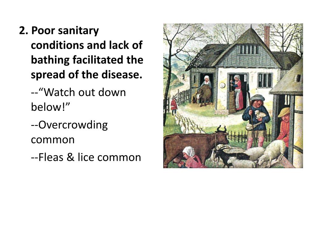 2. Poor sanitary conditions and lack of bathing facilitated the spread of the disease. --“Watch out down below!” --Overcrowding common --Fleas & lice common