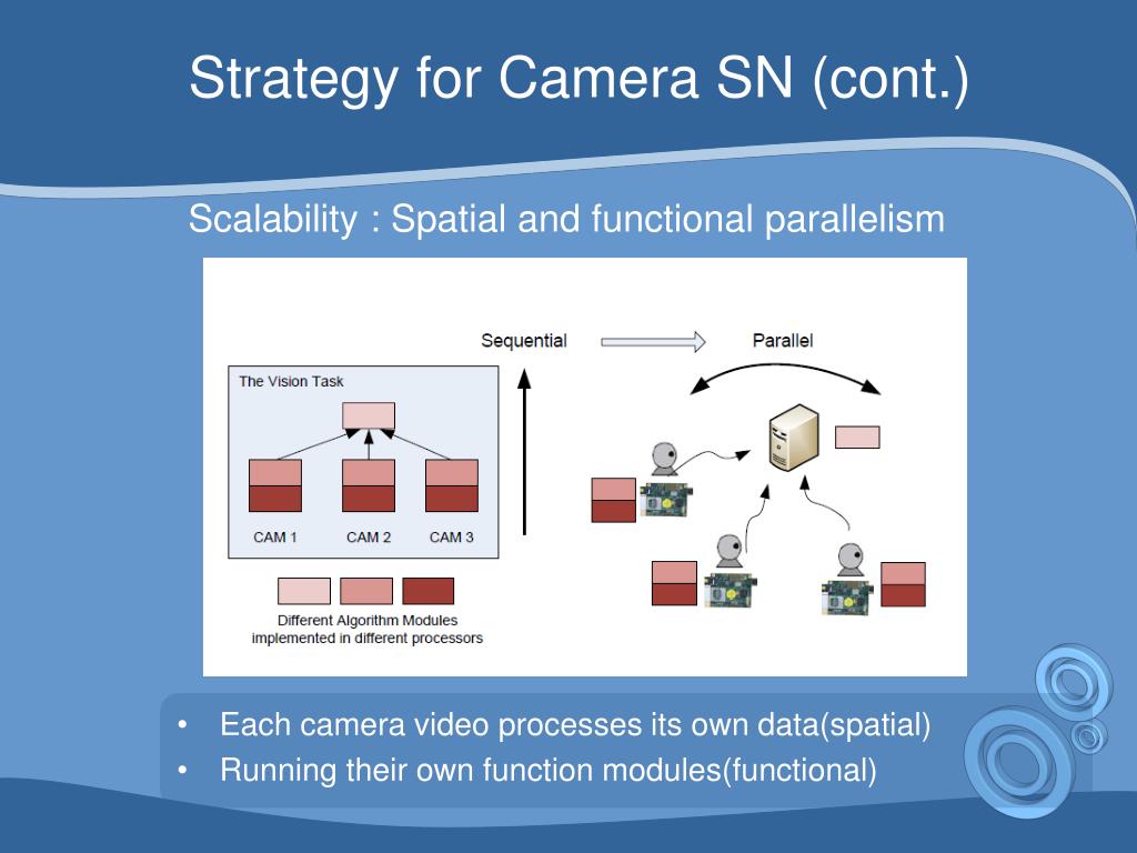 Scalability : Spatial and functional parallelism Strategy for Camera SN (cont.) • Each camera video processes its own data(spatial) • Running their own function modules(functional)