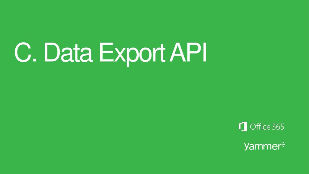 Hvad er Data Export API? • Med Data Export API kan en it-administrator konfigurere og tilpasse automatiske og tilbagevendende eksporter for netværket. Det giver dig bedre kontrol, større fleksibilitet og flere muligheder for tilpasning. • URL: https://www.yammer.com/api/v1/export • Metode: GET • Godkendelse: OAuth 2-adgangstoken. Brugeren skal være en godkendt administrator. På Yammer Developer Network kan du se, hvordan du opretter et adgangstoken.