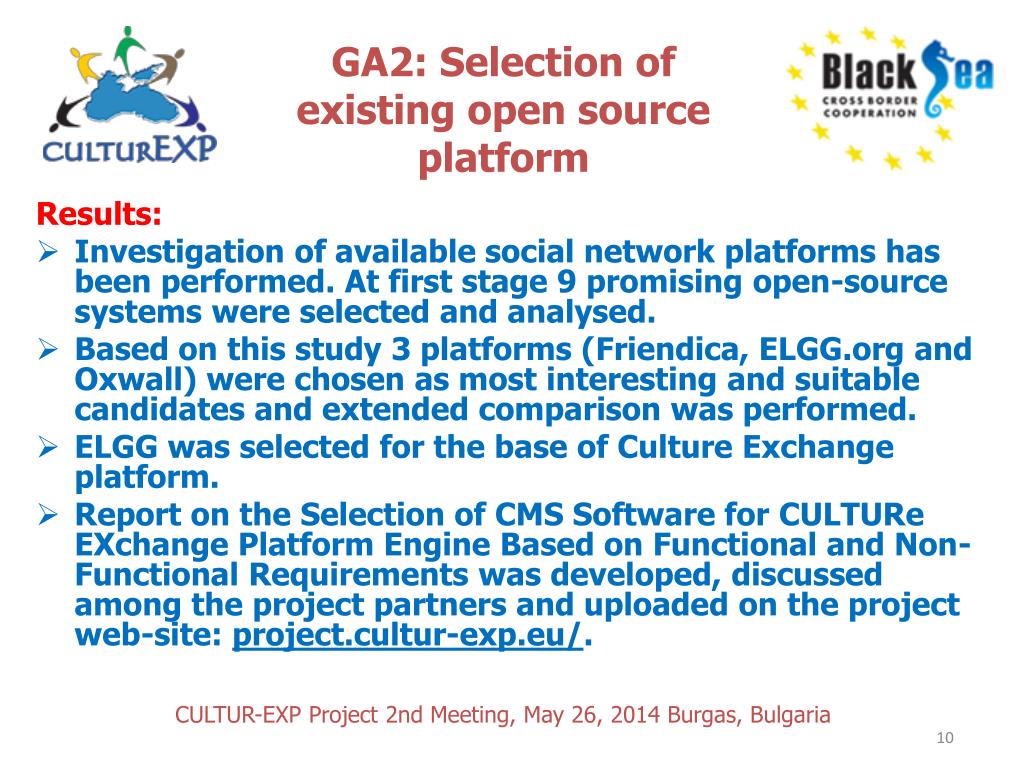 GA2: Selection of existing open source platform Results: • Investigation of available social network platforms has been performed. At first stage 9 promising open-source systems were selected and analysed. • Based on this study 3 platforms (Friendica, ELGG.org and Oxwall) were chosen as most interesting and suitable candidates and extended comparison was performed. • ELGG was selected for the base of Culture Exchange platform. • Report on the Selection of CMS Software for CULTUReEXchange Platform Engine Based on Functional and Non-Functional Requirements was developed, discussed among the project partners and uploaded on the project web-site: project.cultur-exp.eu/. CULTUR-EXP Project 2nd Meeting, May 26, 2014 Burgas, Bulgaria