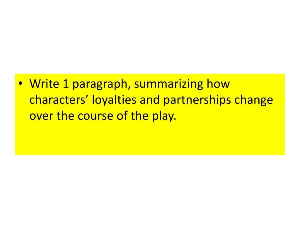 Write 1 paragraph, summarizing how characters’ loyalties and partnerships change over the course of the play.