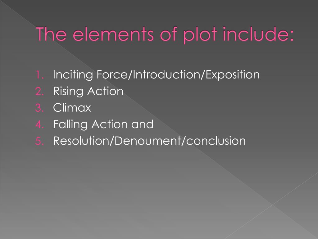 The elements of plot include: • Inciting Force/Introduction/Exposition • Rising Action • Climax • Falling Action and • Resolution/Denoument/conclusion